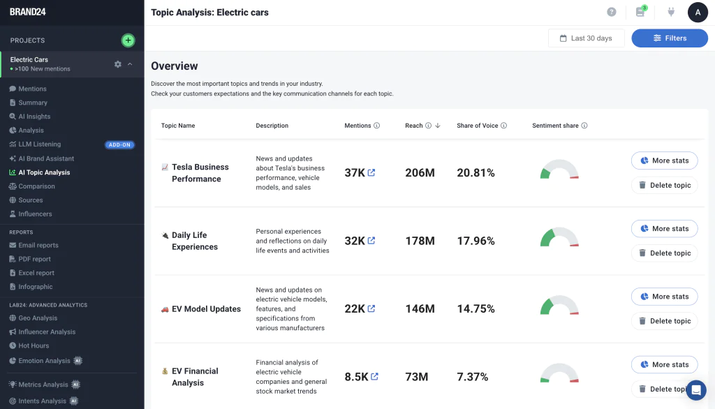 Analiza tematów AI w projekcie monitorowania rynku „Samochody elektryczne”.