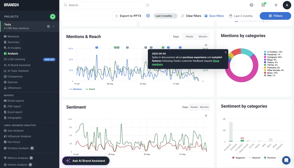 Zakładka Analiza dla projektu „Tesla” ze Zdarzeniami AI pokazującymi jeden z powodów wzrostu zasięgu.
